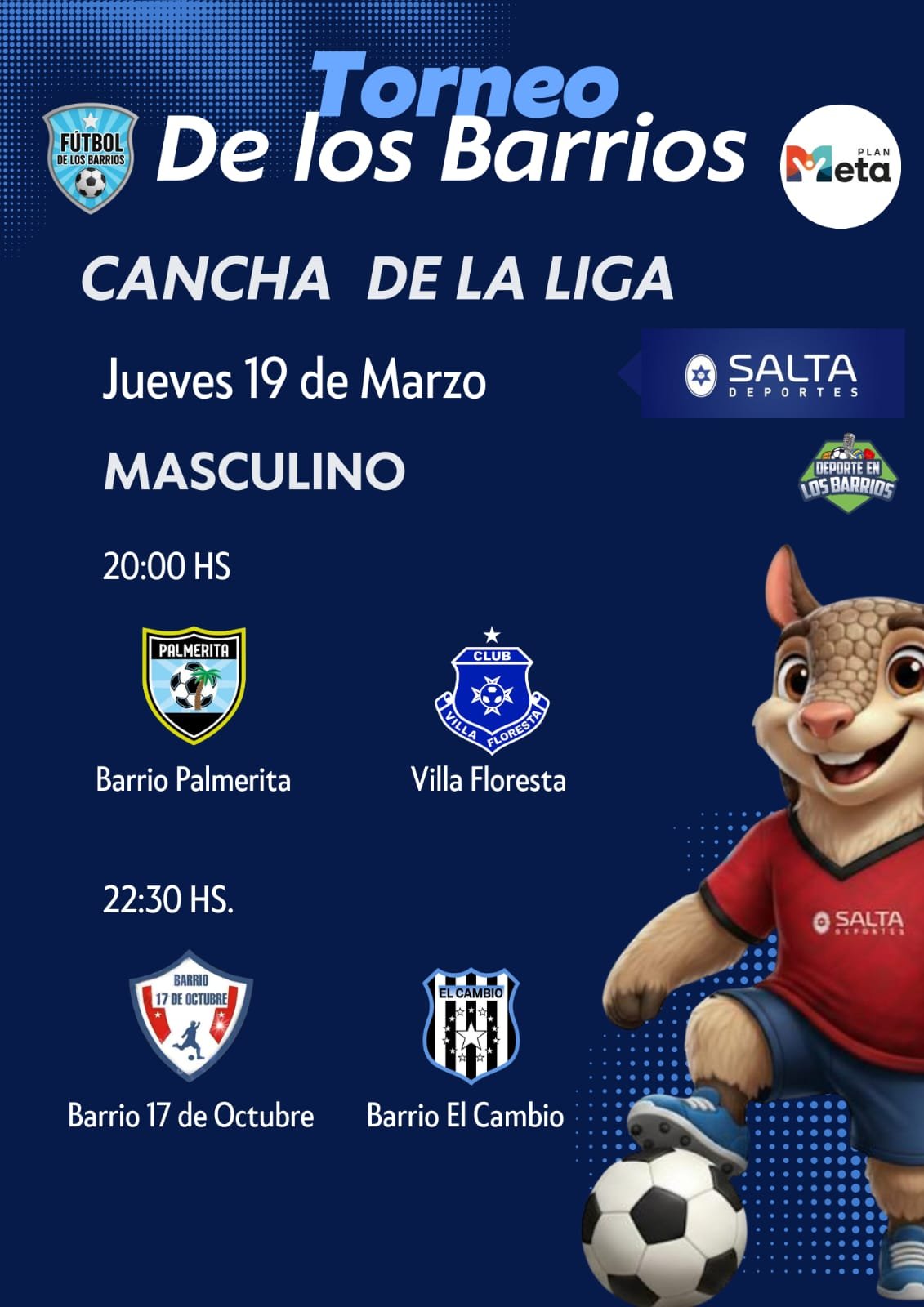 La actividad continuará hoy jueves 19 de marzo con nuevos encuentros de playoffs: a las 20:00 horas jugarán Barrio Palmerita frente a Villa Floresta, y a las 22:30 horas será el turno del cruce entre Barrio 17 de Octubre y Barrio El Cambio.