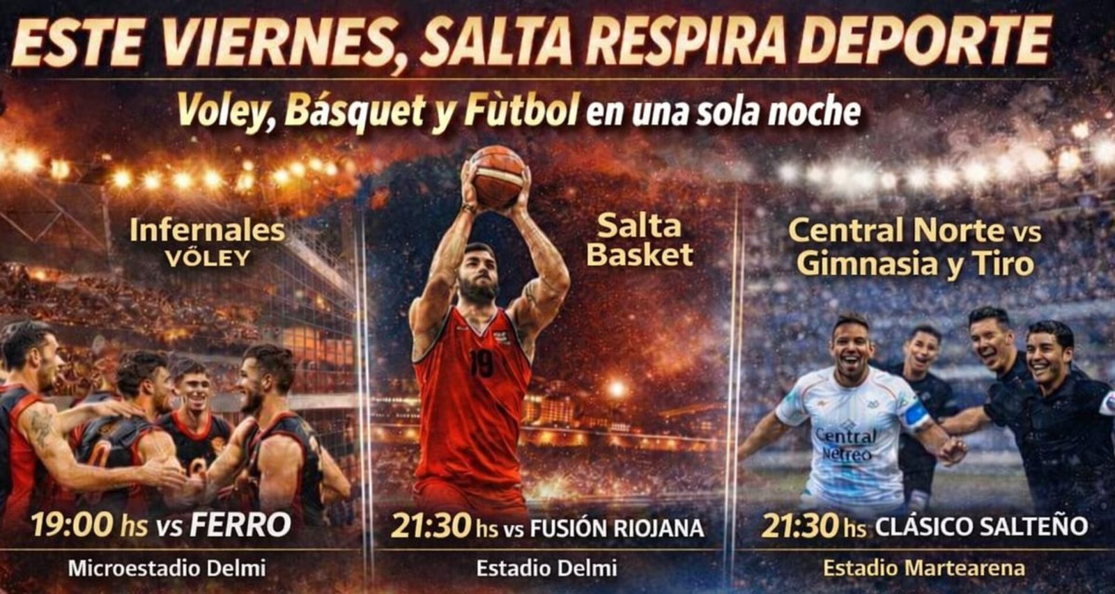 Este Viernes 23 de enero, Salta vivirá una jornada deportiva histórica. Vóley, básquet y fútbol de primer nivel se darán cita en una misma noche, transformando a la ciudad en el epicentro del deporte nacional y ofreciendo múltiples opciones para que los hinchas acompañen su pasión.